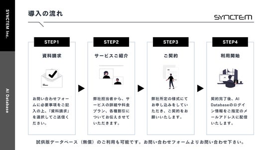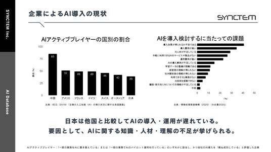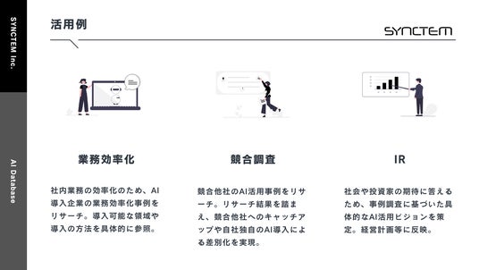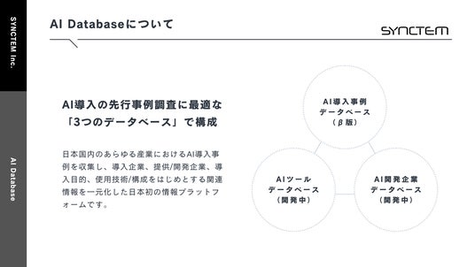 AI領域を中心にリサーチ&コンサルティングサービスを提供するSYNCTEM合同会社(本社:神奈川県横浜市、代表執行役:土橋拓馬)は、日本初となる国内企業のAI導入事例データベース「AI Database」の提供を開始いたします。AIの導入を検討されている企業担当者様が、簡単かつ高精度にAI導入に関する先行事例を調査することを可能にします。