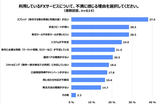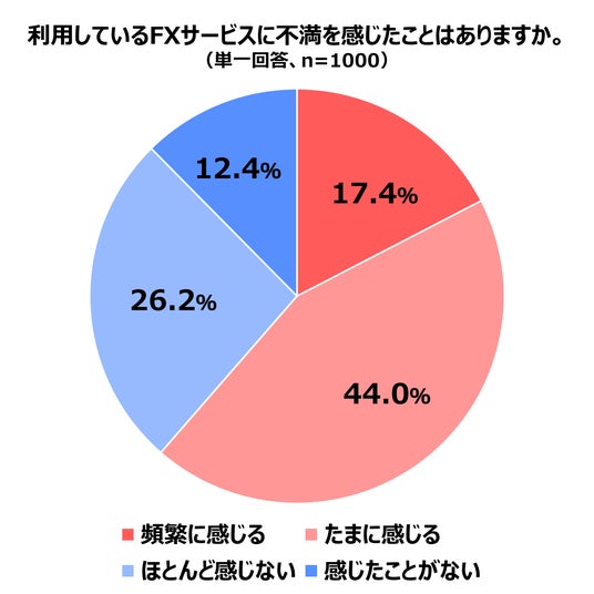 これからFXを始める方やFX会社の乗り換えを検討している方が、より良いサービスを選択できるように、FX経験者1000人を対象とした「FXサービスの不満点調査」を実施しました。「利用しているFXサービスに不満を感じた経験」を聞くと、「頻繁に感じる」(17.4%)、「たまに感じる」(44.0%)を合計して、「不満を感じたことがある」と答えた人の割合は61.4%でした。また、FXサービスに不満を感じた経験のある614人を対象に「不満を感じる理由」を聞くと、「スプレッドが広い」(37.9%)、「約定スピードが遅い」(28.5%)、「取引ツールや分析ツールが使いにくい」(28.5%)が上位3つに挙がりました。