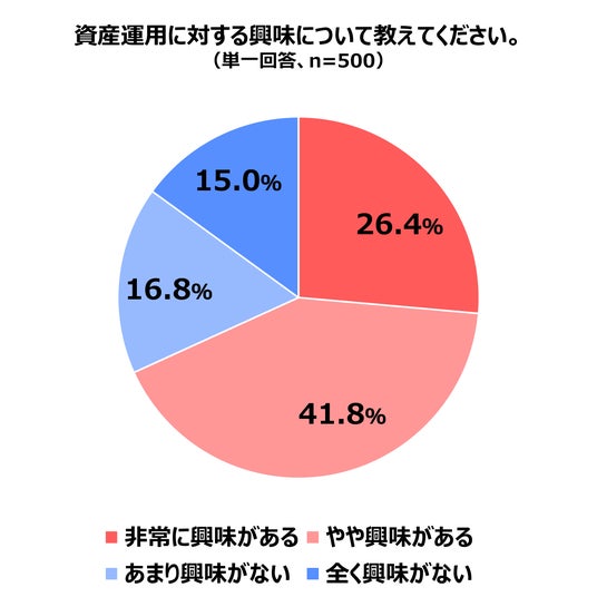 20代~60代の男女500人を対象に、「資産運用とFXに関する意識調査」を実施しました。「資産運用に対する興味」を聞くと、「非常に興味がある」(26.4%)、「やや興味がある」(41.8%)を合計して、「興味がある」と答えた人の割合は68.2%でした。新NISA制度の開始、日経平均株価の最高値更新、マイナス金利の解除など、金融や経済の話題が盛り上がる中、過半数の人が資産運用に対して関心を持っている結果となりました。