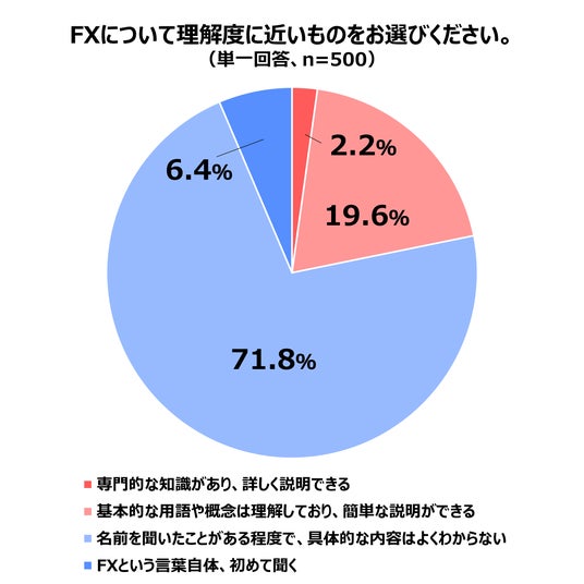 「FXについての理解度」を聞くと、「名前を聞いたことがある程度で、具体的な内容はよくわからない」(71.8%)、「FXという言葉自体、初めて聞く」(6.4%)を合計して、「FXを理解していない」と答えた人の割合は78.2%でした。資産運用を行うためには正しい知識が必要ですが、FXについては十分に理解が進んでいるとは言えず、そのため障壁やハードルの高さを感じる人が多いことが示唆されます。