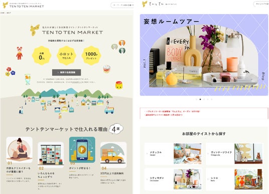 当社は2017年より、「誇るべき伝統・技術」「優れたデザイン・機能美」を備えた衣・食・住・遊の厳選アイテムを提供する卸サイト「TEN TO TEN MARKET(テントテンマーケット)」を運営しています。消費者の手元にすでに届いている流行商品はもちろんのこと、最先端アイテムとして店頭に置けるトレンド先取り商材や他にはない希少性の高い逸品にもこだわるなど、顧客である小売店とのリレーションを強め、市場ニーズへの高感度な商品展開に努めてまいりました。運営実績を重ねる中で、個性的な作家・クリエイターアイテムのラインナップや、商品トレンドの目利き力、さらにはその時々の流行に最適な厳選テイストやブランドを掛け合わせた商品のコーディネート提案力を、着実に積み重ねてまいりました。