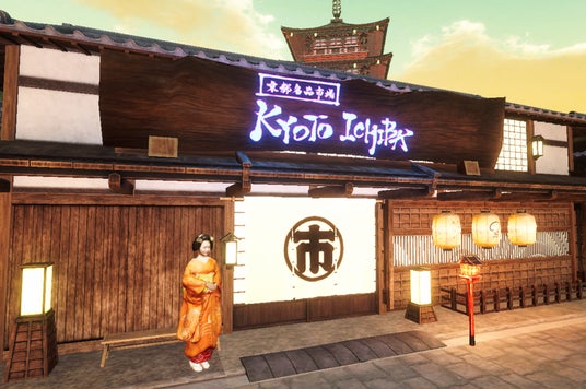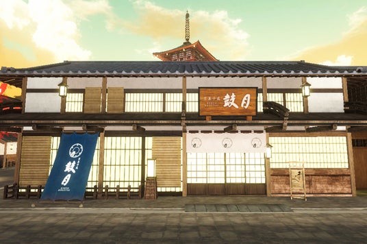 メタバースの世界に入ると、エントランスエリアからスタートします。鳥居を抜け、橋を渡って中心街へ移動すると、京都の人気店が街の至る所に出店しており、宇治茶、京菓子、京漬物、京都の伝統工芸品等外国人にも人気のお土産物をメタバース空間内から商品を購入することができ、海外配送にも対応しています。