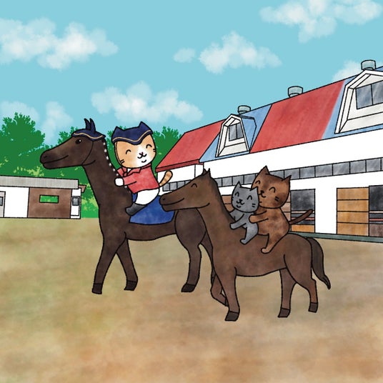HITOMIさん(NL member)の描くイラストは幸せそうな馬と牧場に住む2匹の猫「チビ」と「福豆」も描かれている