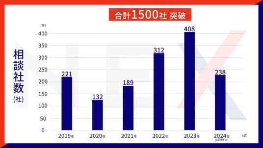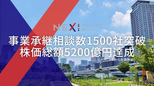 2024年6月、株式会社NEX Consulting(以下「当社」)は、2019年から計測を開始した事業承継の相談件数が1500社を突破し、株価総額ベース※で5200億円に達したことをお知らせします。
