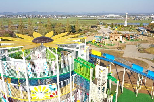 「ひまわりの丘公園」は、夏には40万本のひまわり、秋には400万本のコスモスが咲き誇る美しい公園。令和4年12月には、関西最大級の遊具広場がオープンし話題を集めています。特に、4階建ての「ひまわりタワー」は、トランポリンや巨大ネットなどがあり、子どもたちに大人気! このスタンプラリーを機に、ぜひ遊びに行ってみませんか?