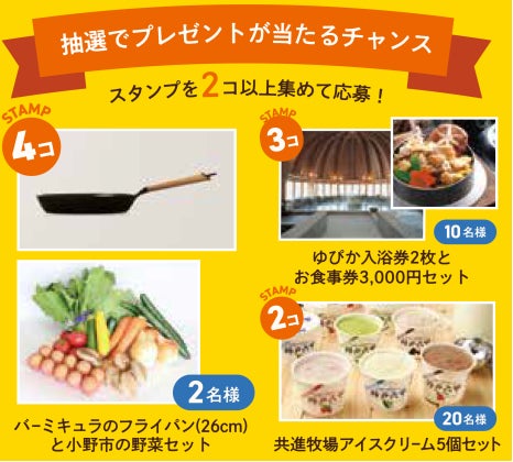 集めたスタンプの数によって応募できる賞品が変わります。スタンプ4個で、人気の「バーミキュラ」のフライパンと小野市の新鮮な野菜のセット、スタンプ3個で小野市の日帰り温泉施設『白雲谷温泉ゆぴか』の入浴券とお食事券のセット、スタンプ2個で『共進牧場』のアイスクリームのセットに応募できます。