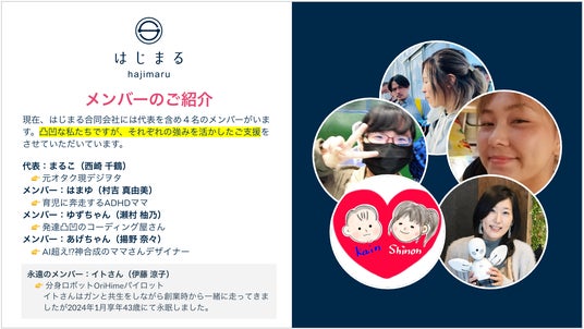 主に鹿児島県内の事業者・自治体におけるECサイト(ネットショップ)運用やブランディングの支援を行う企業。メンバー全員が女性で、なおかつ半数が発達障害を持っているのが特徴。「だれかのはじめるをはじまるに」をモットーとして掲げ、さまざまな事情で新しいことを「はじめる」のが難しい方に対し、最適なアプローチを提供することで、物事が「はじまる」流れを作っています。【会社概要】