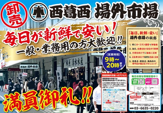 市場から直結で仕入れる鮮度抜群の海の幸。安心・安全な野菜、果物。地域で愛される肉の専門店など、食の専門店が集まる総合市場です。周辺にお住いの方、業務用仕入の方、お気軽にお越しください。住所 :〒134-0088 東京都江戸川区西葛西6丁目7番1