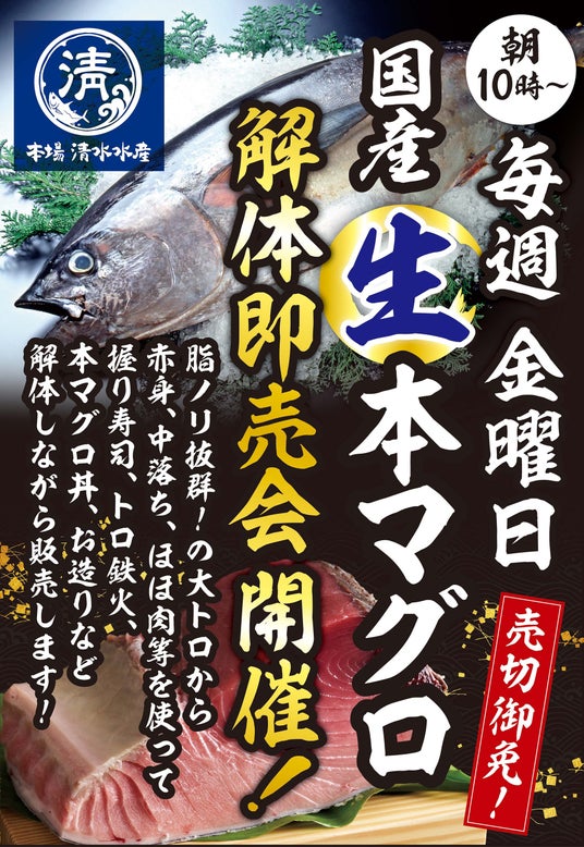 今年3月に東京メトロ東西線「西葛西駅」のメトロセンター4号館にオープンした「西葛西場外市場」にて毎週金曜日 朝10時~ 国産本生マグロをまるまる1匹を使用して解体即売会を実施しています。脂ノリ抜群の大トロから赤身、中落ち、ほほ肉等、国産生本マグロを余すとこなく使用して、冊の切り身はもちろん、握り寿司、トロ鉄火、本マグロ丼、お造りなど多種多彩なマグロを気軽に味わえると好評を頂ております。