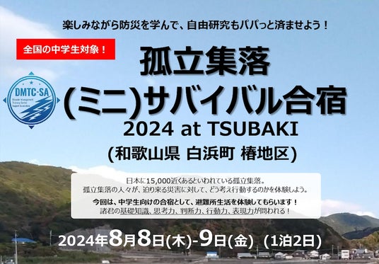 一般社団法人 災害対策トレーニングセンター支援会では、和歌山県西牟婁郡白浜町椿地区にて、中学生を対象とした合宿形式の災害対策ワークショップ「孤立集落(ミニ)サバイバル合宿 2024 at TSUBAKI」を開催することとなりました。現在、本イベントの参加者を募集しております。和歌山県、関西、全国の中学生のみなさまのご参加をお待ちしております!