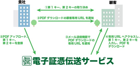 証憑PDFファイルを顧客に直接送るのではなく、当サービスに証憑PDFファイル、2つのキーワード、宛先名、宛先の電子メールアドレスを登録して頂きます。