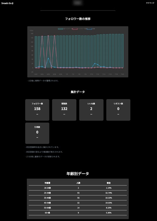 Sreads Goを活用することで ユーザーは自身のThreadsアカウントに関する詳細なインサイトを確認することができます。β版では各機能を無料にて提供いたします。