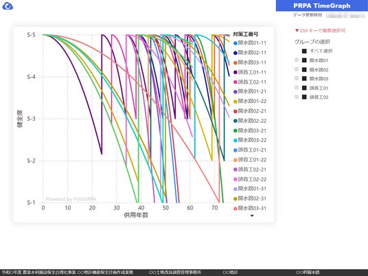 付帯アプリ「PRPA TimeGraph」は、農業土木の機能保全保全計画書のうち、対策時期のグラフ(様式9)作成を支援します。