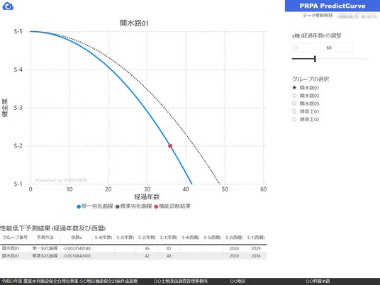 付帯アプリ「PRPA PredictCurve」は、農業土木の機能保全保全計画書のうち、土木構造物の性能低下予測(様式7-1)作成を支援します。