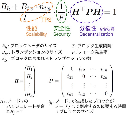 京都大学 大学院情報学研究科 中井大志 博士課程学生、櫻井晶 同博士課程学生、京都大学 学術情報メディアセンター 廣中詩織 助教、首藤一幸 同教授らの研究グループは、ブロックチェーンのトリレンマを表現する数式を発見しました。具体的には、Proof of Work型のブロックチェーン(例:Bitcoin)において、安全性を下げるフォークという現象が起きる確率の逆数を安全性の指標とした場合に、その項と、性能を表す項、分権性を含む項、それら3項の積が一定である、つまり3項がトレードオフであるという数式を得ました。
