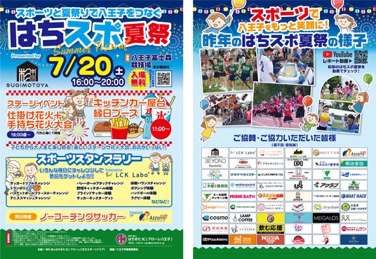 アローレ八王子(運営団体:NPO法人はちきたSC 所在:東京都八王子市 代表:紙本諭)は、2024年7月20日(土)八王子富士森競技場にてスポーツと夏祭りで八王子をつなぐイベント「はちスポ夏祭Presented by SUGIMOTOYA」を開催いたします。