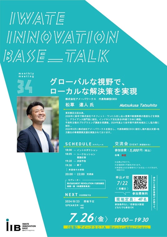 2024年7月26日(金)、株式会社アメーバワークスの代表取締役CEO 松草達人が、岩手イノベーションベース第34回月例会にて講演会を行います。