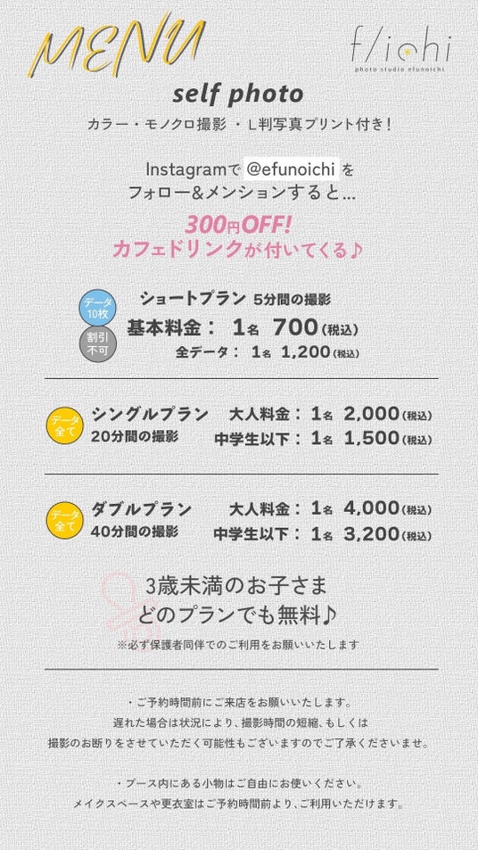 部屋のタイプはナチュラル・ポップの2種類。撮影データとL判写真をお渡しします。インスタフォロー&メンションで300円OFF&お持ち帰りのドリンクサービス!