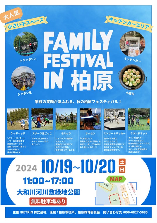 RETRIN株式会社は、地域の家族が楽しみながら健康を促進し、新しいスポーツを体験できる「Family Festival in 柏原」を、2024年10月19日(土)と10月20日(日)に柏原市立柏原公園で開催します。このフェスティバルは、家族全員が参加できるアクティビティを通じて、地域の連帯感を深めることを目的としています。