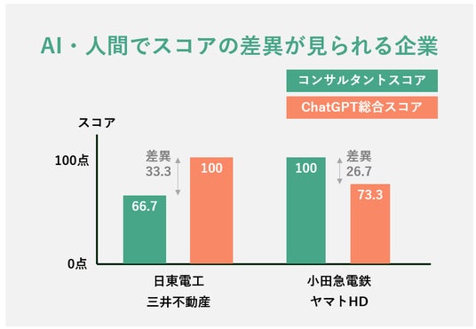 AIと人間のスコアに最も差異が現れたのは日東電工・三井不動産の2社、次いで小田急電鉄・ヤマトHDの2社