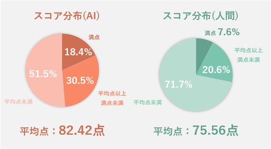 次に日経225の平均点ですが、AIは82.42点、人間は75.56点となりました。内訳ですが、満点がついた「積極的に開示していこうという意思、意欲が見られる企業」はAI:18.4%(41社)・人間:7.6%(17社)、平均点以上満点未満となった「必要最小限の開示情報にプラスアルファする形で、人的資本に関する開示があり、開示に比較的前向きな企業」はAI:30.5%(68社)・人間:20.6%(46社)、平均点未満となった「開示は必要最小限に留まっている、または開示内容について試行錯誤中であり、思いを込めるまでには至っていない企業」はAI:51.1%(114社)、人間:71.7%(160社)となっており、人間による判断を伴う方が高スコアをつけにくい形になりました。