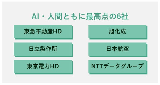 まず、AIと人間が共に最高点(100点)をつけたのは東急不動産HD・旭化成・日立製作所・日本航空・東京電力HD・NTTデータグループの6社(順不同)でした。