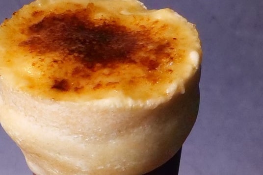 表面をサトウキビ糖でカリカリにキャラメリーゼし、1枚ずつ手焼きするもちもちのクレープ生地で濃厚なとろとろ自家製プリンを包みました。食べ進めるうちに、さまざまな食感の違いを楽しめる贅沢なスイーツです。