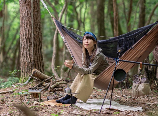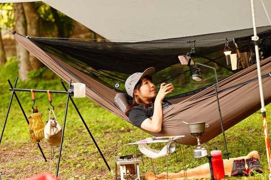 キャンプで使えるハンモックは、テントにはないさまざまな特性を持っています。荷物はテントよりも軽量となり、設営・撤収だって数分以内に完了。地面に寝るときでは得られない浮遊感と包まれ感を味わいながら、とろけるように眠りにつくことができるのもハンモックの醍醐味です。