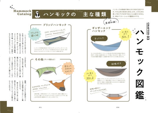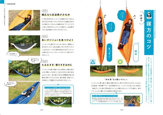 ハンモックキャンプに必要な道具の紹介はもちろん、設営&撤収の基本、タープの張り方、季節ごとの宿泊術などを丁寧に解説。また、オススメのハンモックカタログから、ハンモックがさらに楽しくなるオプションアイテムの紹介に至るまで幅広いコンテンツが用意され、この一冊があれば今すぐにハンモックキャンプを始められるガイド本となっています。