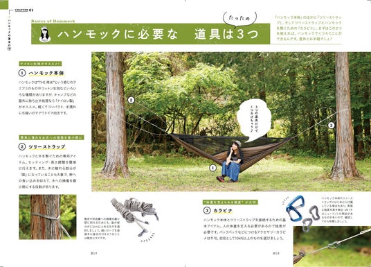 ハンモックの設営方法や道具選びなども、極力シンプルに、わかりやすく解説しています。