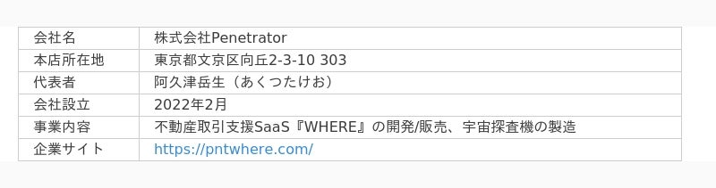 株式会社Penetratorは、宇宙から地球の不動産課題を解決することをビジョンに掲げているJAXA発のスタートアップ企業です。創業者の阿久津は、これまでに8社の不動産関連企業を創業し、一つ上の視座から不動産市場を変えたいという志で2022年2月にPenetratorを創業。不動産取引支援SaaS『WHERE』のベータ版を2023年6月にリリースし、すでに大手デベロッパーをはじめとするお客様にご利用いただいています。