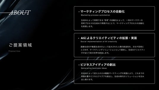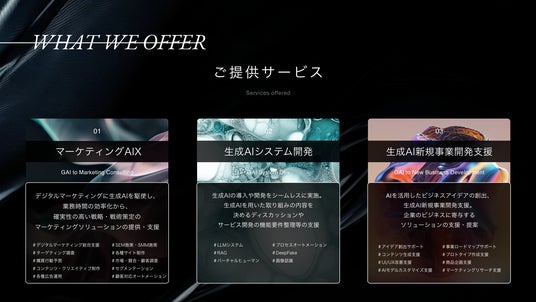 私たちは、単なるパッケージやサービスの提供に留まらず、デジタルマーケティングと生成AIの専門家とのコラボレーションによって、クライアントのビジネスを次のステージへ導く、本質的で革新的なソリューションを提供してまいります。」