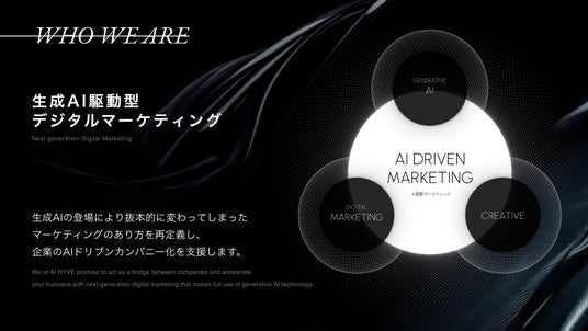 「生成AIを活用した新しいデジタルマーケティング手法『AIドリブンマーケティング』を社会に普及させるため、新会社『AI HYVE』を設立いたしました。生成AIの登場により、特にデジタルマーケティング分野では、従来プロフェッショナルに依存していた業務をアプリケーション化することが可能となり、抜本的な改革が求められています。