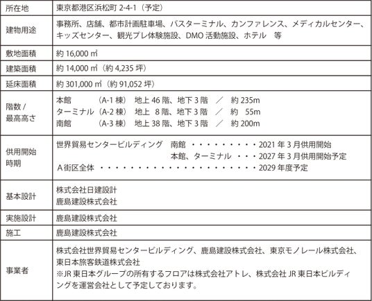 都港区、代表取締役社長:宮田 久嗣)、東日本旅客鉄道株式会社(本社:東京都渋谷区、代表取締役社長:喜㔟 陽一)が推進しております「世界貿易センタービルディング本館・ターミナル」の建替えプロジェクト(以下、本プロジェクト)は、2027 年に一部開業を迎え、以降順次開業してまいります。