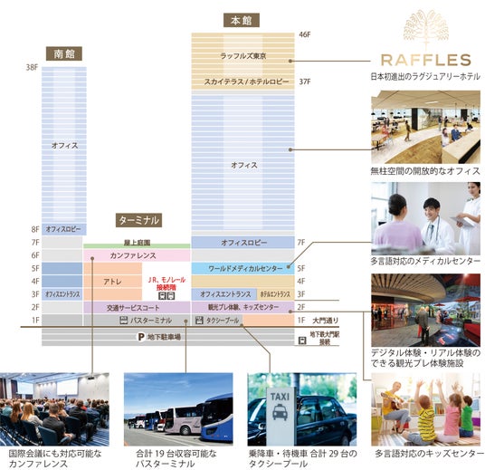 2021 年に先行開業した南館に加え、今後開業を迎える本館・ターミナルには、日本初進出のラグジュアリーホテル(ラッフルズ東京)、商業施設(株式会社アトレ運営予定)・ワールドメディカルセンター・カンファレンス・観光プレ体験施設といった国際性・観光機能の特色がある施設が整備されます。また、浜松町駅と一体となった象徴的な広場や、JR・モノレール・地下鉄・バス・タクシー等の交通機関をスムーズに繋ぐステーションコア、隣接した旧芝離宮恩賜庭園と視覚的に繋がった屋上庭園などの整備を通して、利用者の利便性が向上し、街としての魅力が高まっていきます。