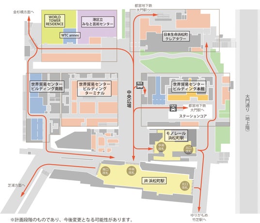 浜松町駅西口エリアにはA街区、B街区、C地区にわたり約 18 万平方メートル のオフィス、ホテル、商業施設、カンファレンス、医療施設、観光プレ体験施設、住宅、芸術センターといった多種多様な機能が整備され、日本と世界をつなぐ” 一歩目” として相応しいエリアになります。