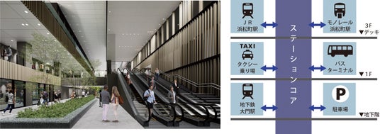浜松町駅は鉄道(3 駅 5 路線)・バス・タクシー等、建替え前から様々な交通機関が乗り入れる交通の要衝地でした。本プロジェクトでは、ステーションコアと呼ばれる吹き抜け空間を整備することにより、これらの交通機関相互のアクセス性を大幅に向上させるとともに、歩行者の憩いの空間も創出します。ステーションコアは浜松町に訪れた人々が様々な交通機関をスムーズに乗り換えられるよう、分かりやすい空間構成であると同時に、浜松町に宿るおもてなしの精神を感じられるデザインとなります。