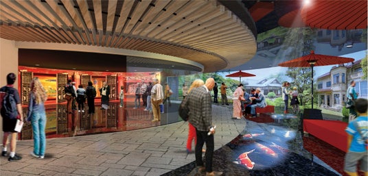 ターミナル 7 階には旧芝離宮恩賜庭園と視覚的につながった屋上広場を整備します。中央部には、かつてこの地にあった大名屋敷・庭園の池泉形状をオマージュした大芝生広場を配し、多くの客人に親しまれてきた庭園の記憶を現代に再構築します。