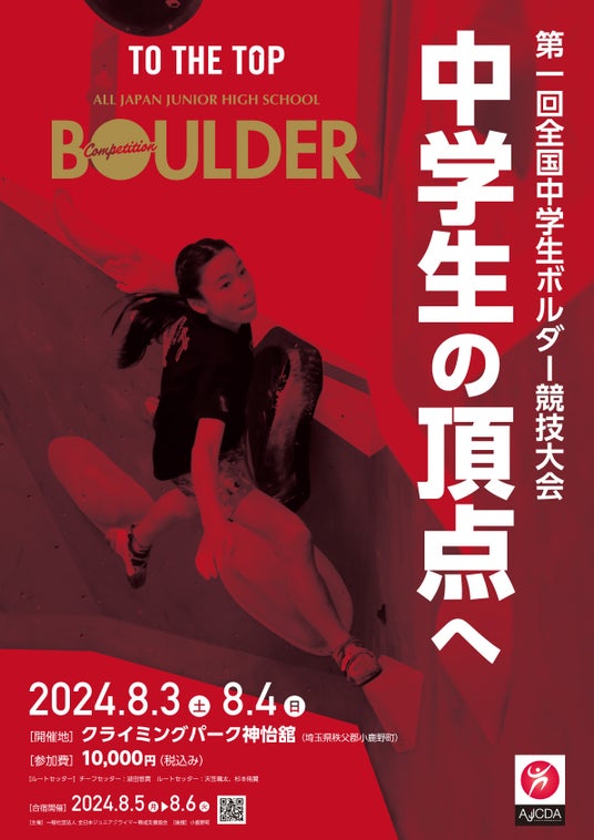 スポーツクライミングを通じて自律した社会の創造を目指す全日本ジュニアクライマー育成支援協会(所在地:東京都、代表理事:太田裕樹)は、中学生を対象とした日本初開催となる「第1回全国中学生ボルダー競技大会」を2024年8月3日(土)・4日(日)に埼玉県秩父郡小鹿野町のクライミングパーク神怡舘にて開催します。本大会に出場する中学生、また来年以降の本大会を目指す小・中学生たちが、スポーツクライミングを通じてお互いに認め合いながら成長していき、より良い未来の担い手になっていくことを目指します。