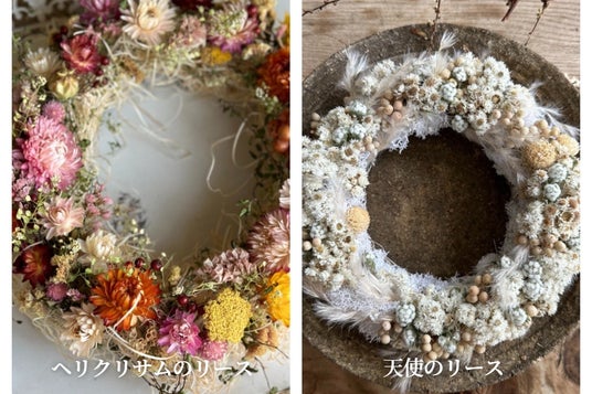 基本のレシピはふんわりとしたヘリクリサムのリース、もうひとつは、天使のリースです。