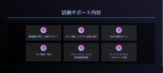 才能がある方でも埋もれてしまう今の時代において、私たちはそんな燻っている未来のアーティストをコンテンツ制作・プロデュース面で全力サポートします。