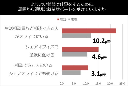 また、よりよい状態で仕事をするための就業サポートについて「生活相談員など相談できる人がオフィスにいる」「シェアオフィスで柔軟に働ける」などの項目で「あったら受けたい」と思っているが、実際には受けられていない、理想と現実のギャップが浮き彫りに。精神障がい者に求められる就業サポートのあり方に関しても課題が明らかになりました。
