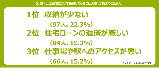 3.購入後に後悔したポイントの第1位は「収納の少なさ」、次いで「住宅ローン返済の厳しさ」と「仕事場や駅へのアクセスの悪さ」がランクイン