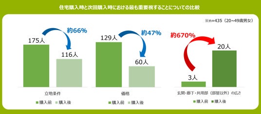 購入前に最も重要視していたポイントと、購入後次回購入する際に最も重要視したいポイントを比較したところ、その項目に大きな変化が見られることが分かった。購入前に重要視されていた「立地条件」や「価格」は購入後では4~6割減となった一方で、「共用部の広さ」は約7倍と全ての項目の中で最も大きな増加率となった。少子高齢化が進む現代の日本において、老後を見据えた住宅購入という意味でも、今後は玄関や廊下、階段などの「共用部の広さ」が重要視される可能性も考えられます。