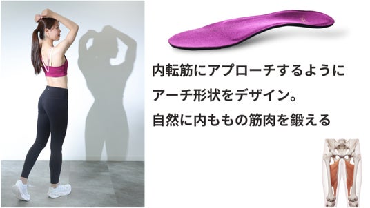 「HBLインソール」は、外側アーチを高くしたことによって、歩くたびに内転筋(内もも)が自然に鍛えられる形状になっています。