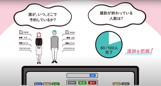 撮影メンバーが自社専用のURLから、任意のスタジオを予約し、事前に取り決めた規定に準じて撮影を行い、撮影された写真がリアルタイムでシステムに納品されます。撮影のキャンセルや変更が発生した場合も、管理部門を介することなく、オンラインで撮影者が単独で簡単に行うことが出来ます。