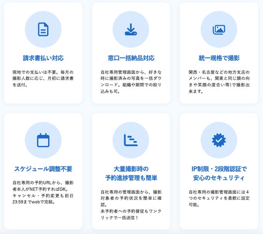 役員や事業メンバー、コンサルタント等の、組織員のプロフィール写真を、統一規格でスケジュール調整不要で請求書払いで撮影することが可能に。