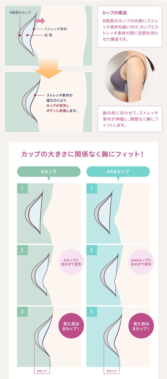 1.と2.により、様々な動きに自然に追従し、胸とカップの間に隙間ができず、美しいシルエットと快適な着け心地を提供します。また、このストレッチ素材により、どんな胸でも優しくフィットし、浮き感なくパカパカしません。