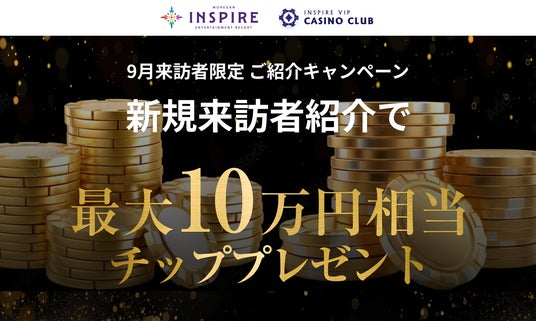 株式会社INSPIRE VIP CASINO CLUB(本社:東京都目黒区)は、2024年9月1日より「紹介キャンペーン」を開催いたします。本キャンペーンの開催期間中に、インスパイアカジノへの新規ご来訪者をご紹介いただいた方には、最大で10万円分のプロモーションチップを進呈いたします。