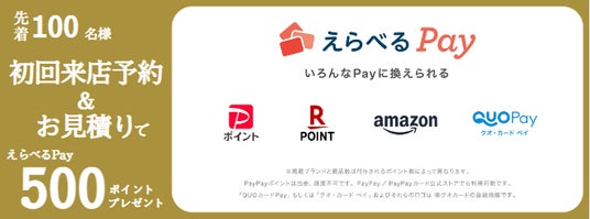 初回来店予約&お見積りをされた方が対象です。ポイントはご来店後、後日メールにてご送付いたします。